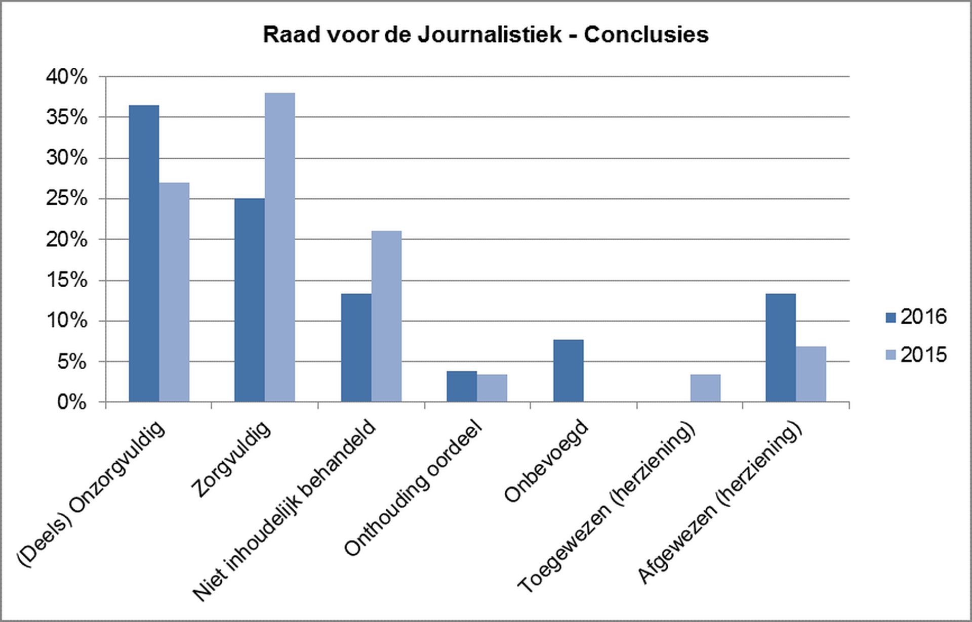 De Raad heeft in 48 zaken conclusies getrokken over de journalistieke zorgvuldigheid, bijna een verdubbeling ten opzichte van 2015 (25 conclusies). Net als andere jaren werd er in de meeste gevallen geklaagd over onjuiste c.q. tendentieuze berichtgeving, het niet (goed) toepassen van wederhoor en schending van de privacy.