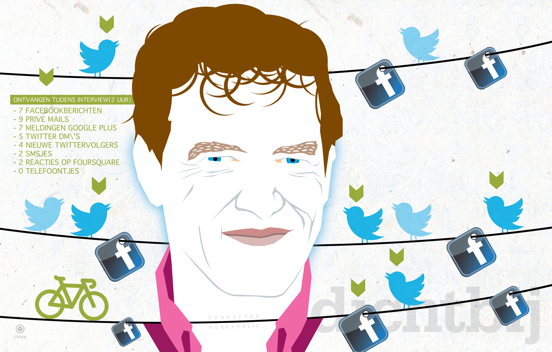 Aan het begin van het interview pakt Bart Brouwers (53), hoofdredacteur van Dichtbij.nl, zijn telefoon, zet hem op stil en legt het apparaat met het scherm naar beneden op het bureau. Om het ding tijdens het gesprek niet meer aan te raken. Na afloop is het resultaat zeven Facebook-berichten gericht aan hem, negen zakelijke mails, zeven Google+ meldingen, Twitter is goed voor vijf directe berichten, zes antwoorden en vier nieuwe volgers, verder twee reacties op een check in op Foursquare, zowaar nog twee sms’jes en nul gemiste oproepen.