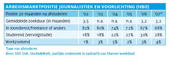 Een krimp in de klassieke journalistieke sector (dag- en publieksbladen) is eind dit jaar nog te verwachten, meent arbeidsmarktdeskundige Siemen van der Werff van Studie & Werk, SEO Economisch Onderzoek van de Universiteit van Amsterdam. Hij baseert zich op algemene economische verschuivingen van dit moment. ‘De neiging van pas afgestudeerden HBO’ers is om door te studeren, om zo de positie op de arbeidsmarkt te verbeteren en de mogelijkheden te vergroten door hun komst op de arbeidsmarkt met twee jaar te vertragen.’