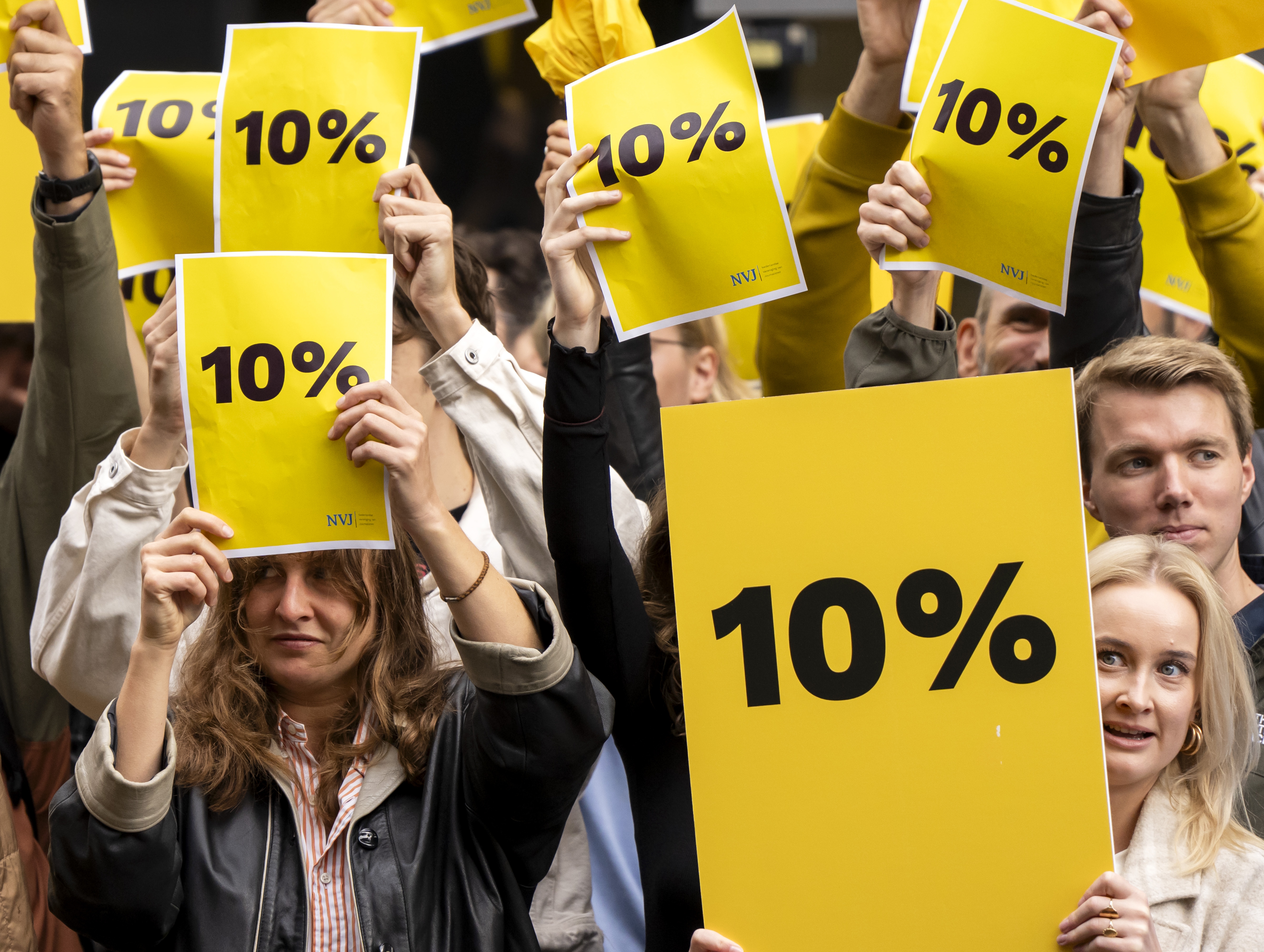 Opvallend genoeg loopt Pieter Klok, de hoofdredacteur van de Volkskrant, donderdagochtend óók rond met een geel bordje, met daarop de tekst ‘10 procent’. ‘Het is raar dat we zelf zoveel schrijven over koopkrachtcompensatie en inflatie, maar het zelf moeten doen met wisselgeld. En de freelancers vissen naast het net’, zegt een redacteur van Trouw.