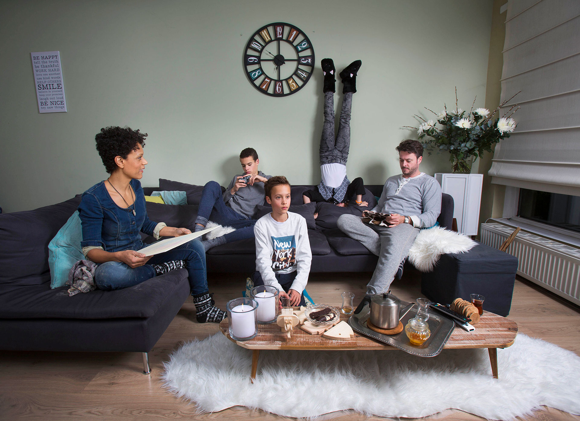 De partytent raakt volgens hem aan de identiteit van de Nederlander. ‘We hebben veel vrije tijd, alles is beleving. Geen event zonder tent. Geld speelt geen rol.’ De fotograaf heeft zich er de afgelopen twee jaar in verdiept en is bij tientallen feestjes opgedoken. De kerstmarkt bij ‘zijn’ kasteel heeft hij wel vijf keer bezocht, voordat hij de juiste foto had. Hij zag de koning en Olympische kampioenen langs partytenten paraderen. Ook het verjaarsfeestje bij zijn naaste buurman liet hij niet lopen. Crone was deelnemer en waarnemer op hetzelfde moment. Zo is hij altijd geweest. Als fotograaf nooit de ‘vlieg op de muur’, maar bewust onderdeel van een feest, bijeenkomst of de samenleving. En toch is er altijd die beroepsmatige distantie, die ook in zijn karakter besloten ligt. Waar dat vandaan komt, is de vraag. Crone buigt zich voorover, Poes raakt in de verdrukking en neemt de benen. Op fluistertoon: ‘Zal ik je iets onthullen? Sst…ik ben de jongste uit een gezin van acht. Wat zegt de psycholoog dan? Dat je de laatste in de rij bent, je beziet op afstand het gedoe van ouderen. Waar maken ze zich druk om?’