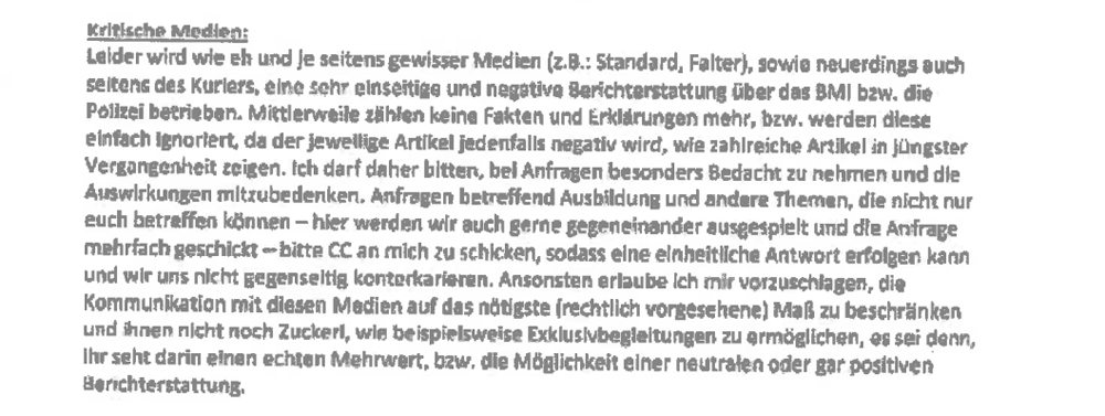 Pölzl schrijft: “Inmiddels tellen feiten en uitleg niet meer of worden die simpelweg genegeerd, zodat het bewuste artikel negatief van toon wordt. Talrijke recente artikelen bewijzen dat.” De woordvoerder roept de politietop op rekening te houden met potentieel negatieve gevolgen en hem informatie-aanvragen per cc toe te zenden, “want we worden graag tegen elkaar uitgespeeld”.