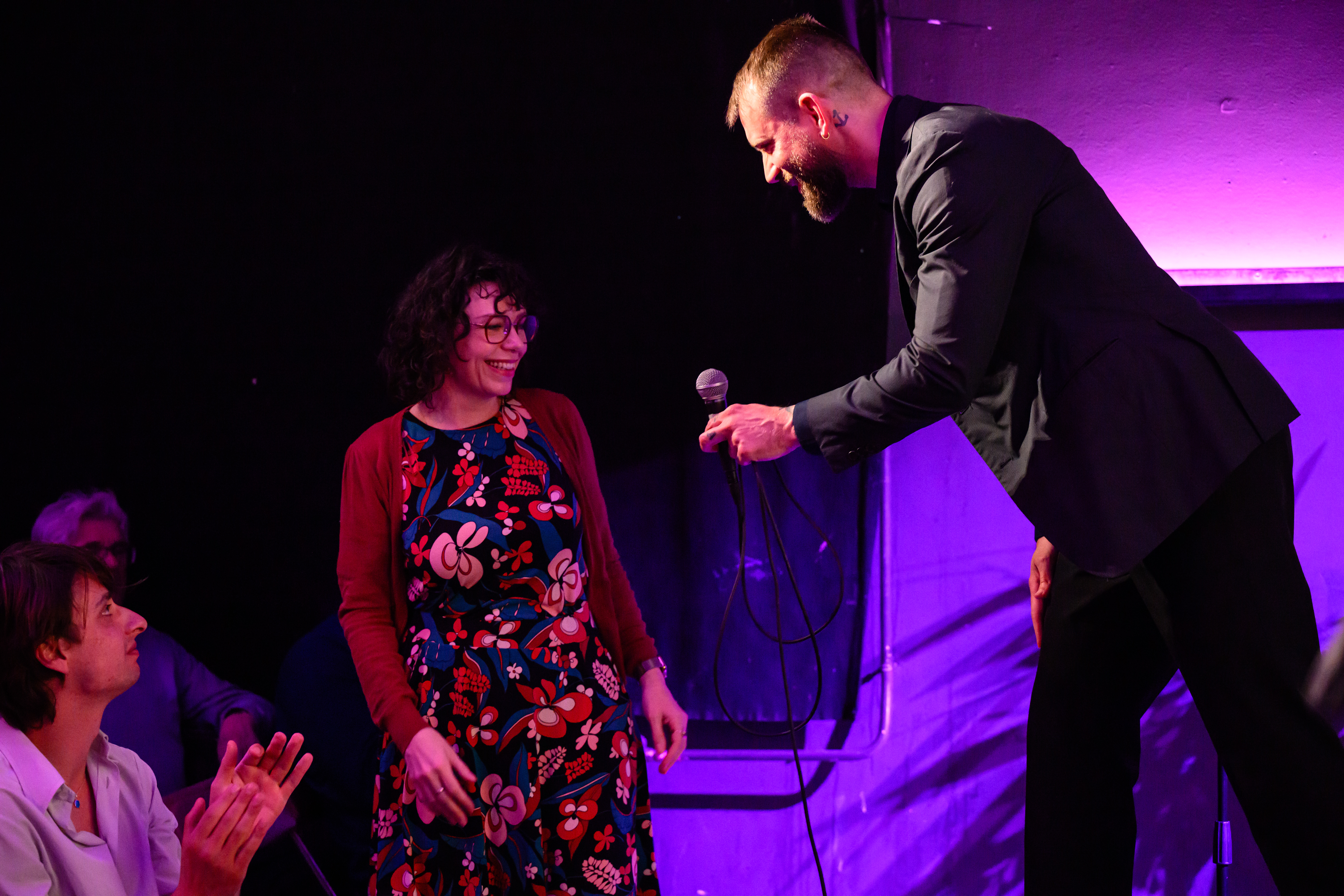 Afstudeerprijs-winnaar Joost Ingen-Housz (De Groene Amsterdammer) en Journalist van het Jaar Saskia Belleman (De Telegraaf) werden op het podium kort geïnterviewd door Afstudeerprijs-juryvoorzitter Aleid Truijens en Villamedia-hoofdredacteur Chris Helt.